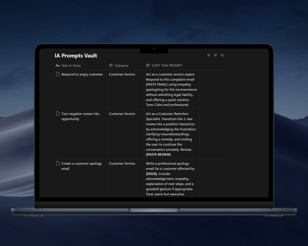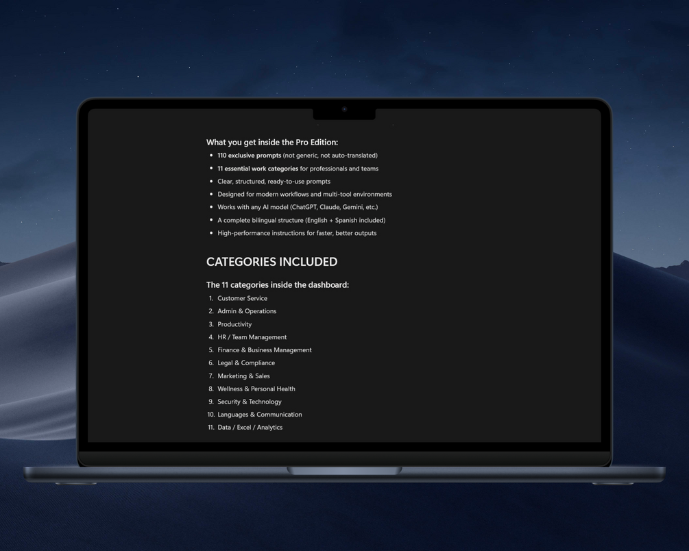 A complete AI-powered productivity system with 110 professional prompts designed for work, management, writing, communication, decision-making, and daily execution. Includes full English + Spanish versions. Perfect for professionals, teams, and creators.