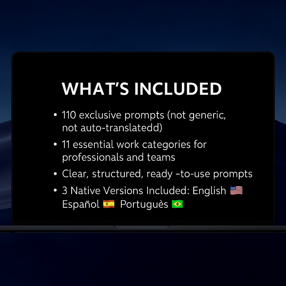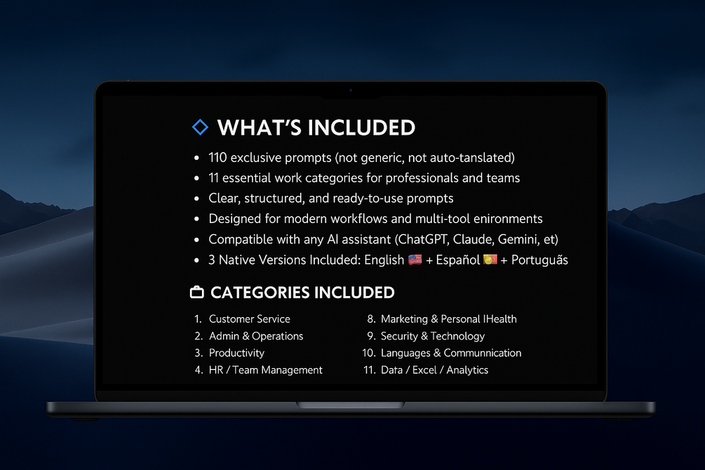 A complete AI-powered productivity system with 110 professional prompts designed for work, management, writing, communication, decision-making, and daily execution. Includes full English + Spanish + Portuguese versions. Perfect for professionals, teams, and creators.
